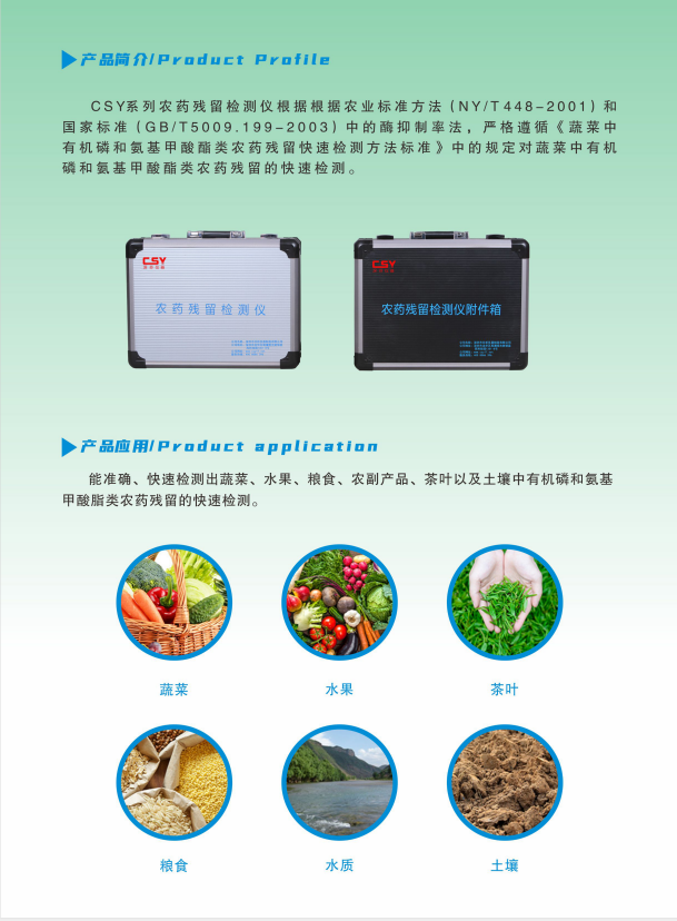 深芬儀器CSY系列農(nóng)藥殘留快速測(cè)定儀可以對(duì)瓜果蔬菜的農(nóng)藥殘留進(jìn)行準(zhǔn)確的檢測(cè)和篩查,杜絕超標(biāo)的農(nóng)產(chǎn)品流入市場(chǎng)。農(nóng)藥殘留快速測(cè)定儀可廣泛應(yīng)用于各級(jí)蔬菜檢測(cè)中心、農(nóng)貿(mào)市場(chǎng)、超市、環(huán)保機(jī)構(gòu)、蔬菜種植基地、飯店、車載及實(shí)驗(yàn)室等食品安全檢測(cè)與監(jiān)控場(chǎng)所等單位對(duì)果蔬中農(nóng)藥殘留的檢測(cè)。